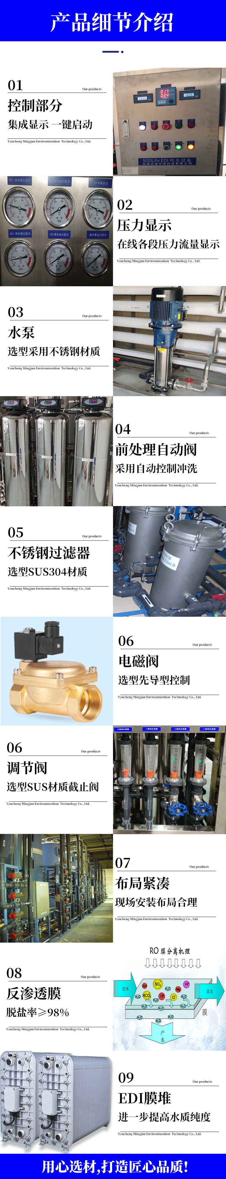 鹽城名俊環(huán)??萍加邢薰局饕a(chǎn)水處理過濾器、軟水器、工業(yè)去離子水、玻璃水純水機(jī)、防凍液純水機(jī)、車用尿素純水機(jī)、超濾(UF)裝置、反滲透(RO)裝置、自動(dòng)加藥裝置、離子交換柱(陰陽床、混床)、超純水去離子(EDI)等系統(tǒng)設(shè)備。應(yīng)用于電子工業(yè)超純水制備、衛(wèi)生行業(yè)用水制備、火力發(fā)電廠及工廠鍋爐軟化除鹽水制備等工